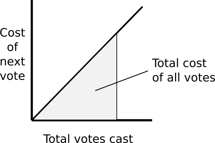 Suppose that you can vote as many times as you want, but voting costs "voting tokens" (say each citizen is assigned \(N\) voting tokens per year), and it costs tokens in a nonlinear way: your first vote costs one token, your second vote costs two tokens, and so forth. If someone feels more strongly about something, the argument goes, they would be willing to pay more for a single vote; quadratic voting takes advantage of this by perfectly aligning quantity of votes with cost of votes: if you're willing to pay up to 15 tokens for a vote, then you will keep buying votes until your last one costs 15 tokens, and so you will cast 15 votes in total. If you're willing to pay up to 30 tokens for a vote, then you will keep buying votes until you can't buy any more for a price less than or equal to 30 tokens, and so you will end up casting 30 votes. The voting is "quadratic" because the total amount you pay for \(N\) votes goes up proportionately to \(N^2\).