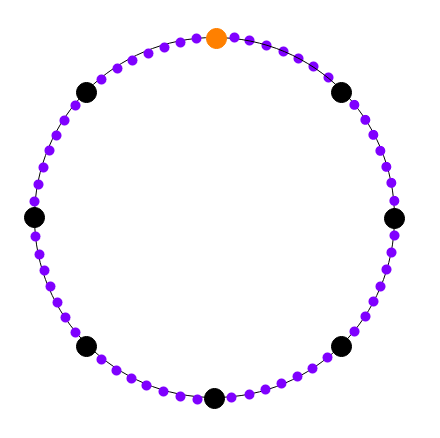 Black: powers of \(g_1\). Purple: powers of \(g_2\). Orange: 1. You can look at successive roots of unity as being arranged in a circle in this way. We are "laying" the computational trace along powers of \(g_1\), and then extending it compute the values of the same polynomial at the intermediate values (ie. the powers of \(g_2\)).
