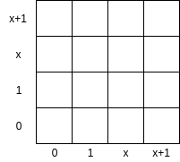 Here, we have the same concept as above, except we use an even spookier mathematical structure, the 4-element field of polynomials over \(Z_2\) modulo \(x^2 + x + 1\). This structure has pretty much no reasonable geometric interpretation, so I'll just give you the addition and multiplication tables: