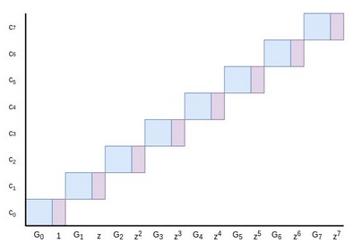 Note that in practice, this is usually done slightly differently as an optimization: instead of attaching the numbers to the points and explicitly dealing with structures of the form \((G_i, z^i)\), we add another randomly chosen base point \(H\) and express it as \(G_i + z^i H\). This saves space.