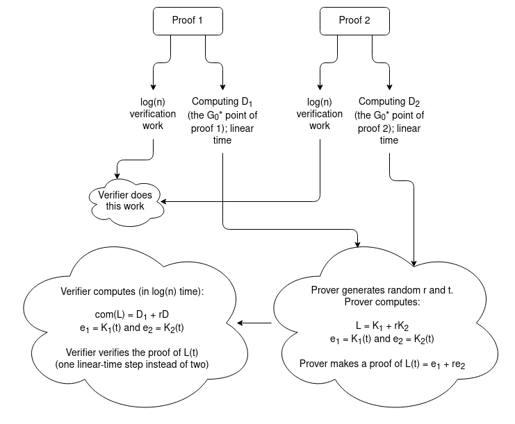 The verifier still needs to do a bunch of extra steps, but all of those steps take either \(O(1)\) or \(O(log(n))\) work: evaluate \(e_1 = K_1(t)\) and \(e_2 = K_2(t)\), calculate the \(\alpha_i\) coefficients of both \(K_i\) polynomials in the first place, do the elliptic curve addition \(com(L) = D_1 + rD_2\). But this all takes vastly less than linear time, so all in all we still benefit: the verifier only needs to do the linear-time step of computing a \(G^*_0\) point themselves once.