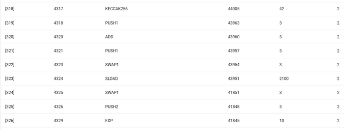 SLOADopcode: 6,400SSTOREopcode: 10,100LOGopcode: 2,149EVM trace of an ENS hash update. Second last column is gas consumption.